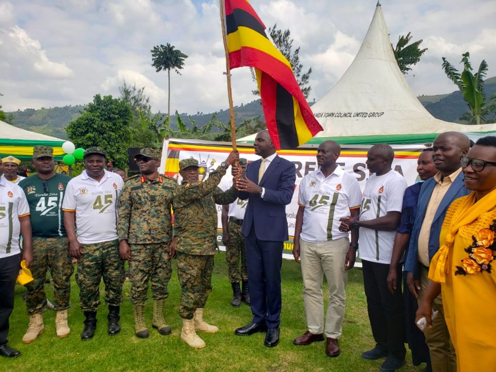 Maj Gen Deus Sande receiving a national flag during launch of Tarehe sita activities in Rubanda district recently. PHOTO BY JOB NAMANYA